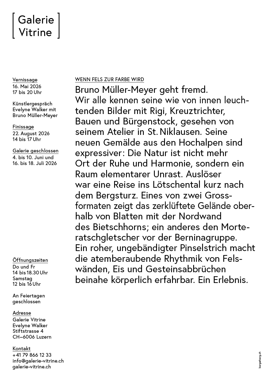 برونو مولر-ماير يخرج عن المألوف. نحن جميعًا نعرف لوحاته التي تبدو وكأنها تضيء من الداخل، والتي تصور جبال ريجي وكروزتريختر وباوين وبورغنستوك، كما تراها عيناه من مرسمه في سانت نيكلاوسن. لوحاته الجديدة من جبال الألب العالية أكثر تعبيرية: لم تعد الطبيعة مكانًا للهدوء والانسجام، بل أصبحت مساحة من الاضطراب العنصري. كان الدافع وراء ذلك رحلة إلى وادي لوتشنتال بعد فترة وجيزة من الانهيار الجبلي. تُظهر إحدى اللوحتين الكبيرتين التضاريس الوعرة فوق بلاتن مع الجدار الشمالي لجبل بيتشهورن؛ وتُظهر الأخرى نهر مورتيراتش الجليدي أمام مجموعة جبال بيرنينا. تجعل ضربات الفرشاة الخشنة الجامحة الإيقاع المذهل للجدران الصخرية والجليد والانهيارات الصخرية قابلاً للتجربة الجسدية تقريباً. إنها تجربة.