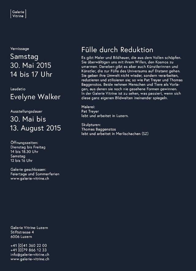 There are painters and sculptors who have an infinity of resources to draw on. We are overwhelmed by their drive to embrace the cosmos. But there also are artists who keep their distance from the universe. They do not reproduce their environment but they treat it, they reduce and shape it. So do Pat Treyer and Thomas Baggenstos. From models of humans and animals they obtain forms which have never be seen before. At Galerie Vitrine they demonstrate what happens when these peculiar images are mirrored in one another.