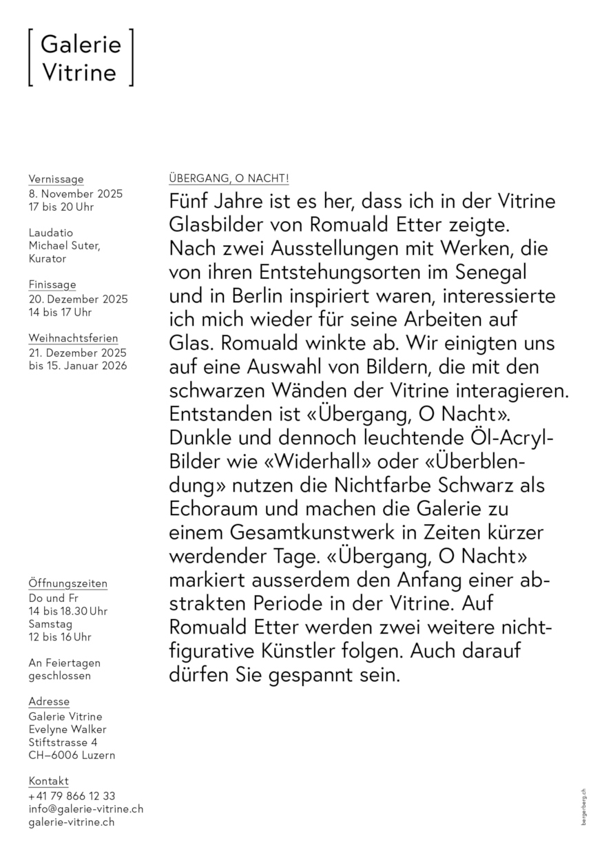 Fünf Jahre ist es her, dass ich in der Vitrine Glasbilder von Romuald Etter zeigte. Nach zwei Ausstellungen mit Werken, die von ihren Entstehungsorten im Senegal und in Berlin inspiriert waren, interessierte ich mich wieder für seine Arbeiten auf Glas. Romuald winkte ab. Wir einigten uns auf eine Auswahl von Bildern, die mit den schwarzen Wänden der Vitrine interagieren. Entstanden ist «Übergang, O Nacht». Dunkle und dennoch leuchtende Öl-Acrylbilder wie «Widerhall» oder «Überblendung» nutzen die Nichtfarbe Schwarz als Echoraum und machen die Galerie zu einem Gesamtkunstwerk in Zeiten kürzer werdender Tage. «Übergang, O Nacht» markiert ausser­dem den Anfang einer abstrakten Periode in der Vitrine. Auf Romuald Etter werden zwei weitere nichtfigurative Künstler folgen. Auch darauf dürfen Sie gespannt sein.